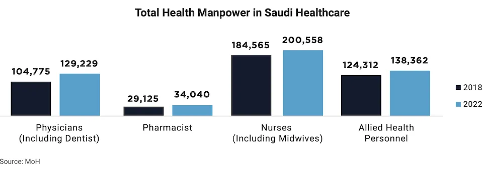 KSA’s healthcare system has witnessed a remarkable nationalization drive between 2018 and 2022. While the overall workforce grew by 17.7%, the reliance on non-Saudi professionals across critical roles like physicians and pharmacists significantly decreased. Physicians saw a particularly impressive shift, with Saudi representation jumping by 14.8%, effectively reversing the earlier non-Saudi majority. This trend extends to nurses and pharmacists, demonstrating a concerted effort to empower Saudi nationals within the healthcare sector. This nationalization push signifies a strategic investment in KSA’s healthcare future, potentially leading to greater autonomy and resilience in the long run.