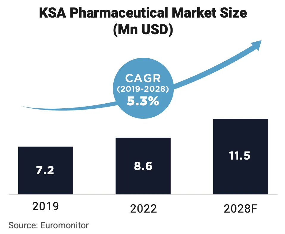 KSA’s pharma market represents an attractive business landscape that is driving international investment by pharma companies in Saudi Arabia. Saudi Arabia’s strategic location and strong logistics infrastructure makes it an attractive base for pharma companies looking to expand their presence in the wider MENA region.