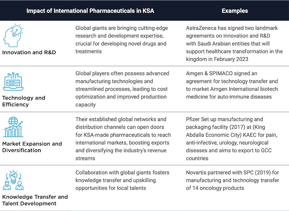 Moreover, several multinational pharmaceutical companies have established a presence in Saudi Arabia, either through direct investment or partnerships with local companies. These companies include Novartis, Pfizer, Sanofi, Merck, and GlaxoSmithKline, among others.