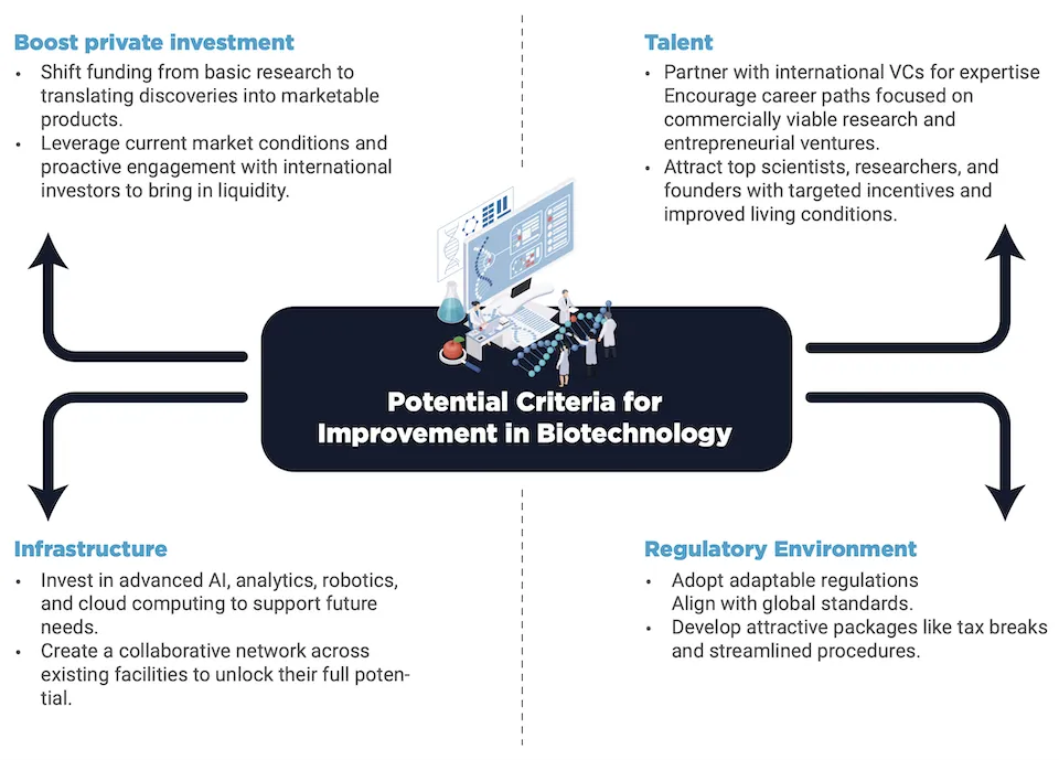 These encourage private sector involvement, support researchers, and promote commercialization. While initial efforts have laid the foundations to develop this ambition, Saudi Arabia needs further action to truly flourish as a global biotech hub.