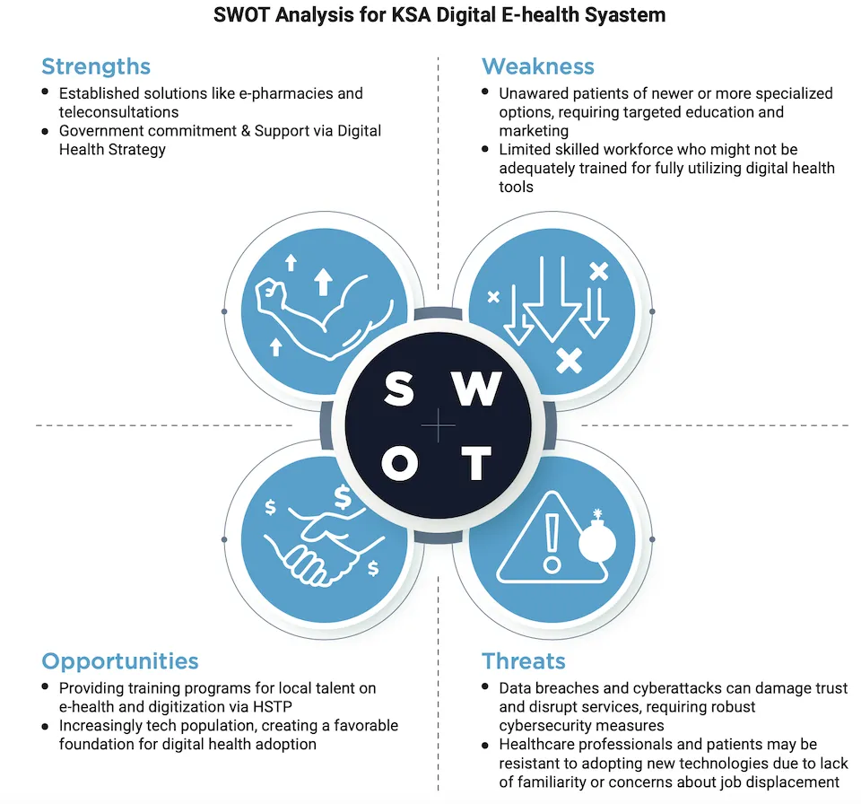 The e-health digitalization is supported by the Saudi government’s proactive approach to digitizing the healthcare system, spearheaded by the comprehensive Digital Health Strategy. Recognizing the potential for improved efficiency, better patient experiences, and enhanced quality of care, the Vision 2030 healthcare transformation plan has laid the groundwork for significant advancements. This includes expanding e-health offerings beyond provider- centric solutions to encompass consumer-facing options like virtual care, a trend accelerated by the COVID-19 pandemic.