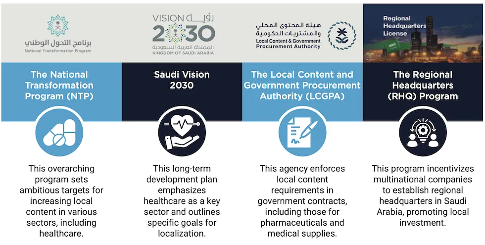 The Saudi government has launched several initiatives that also support localization in pharmaceuticals and healthcare, including: